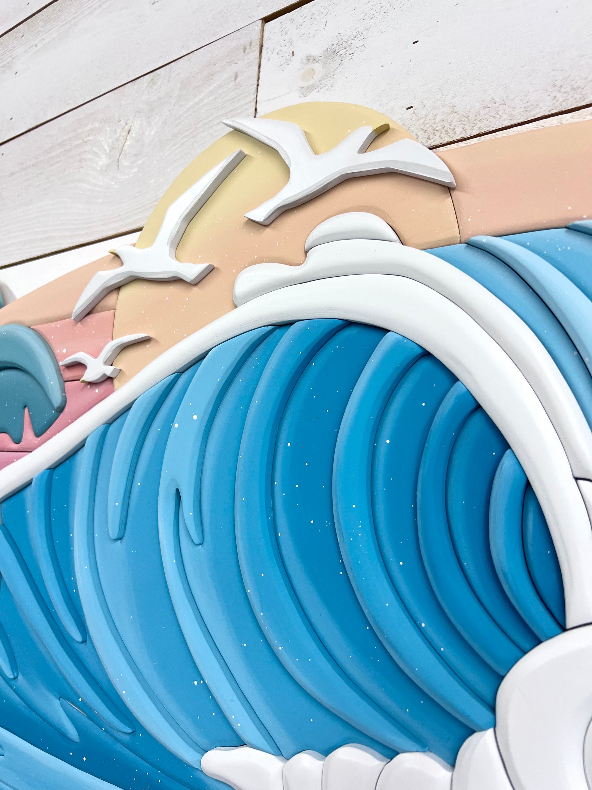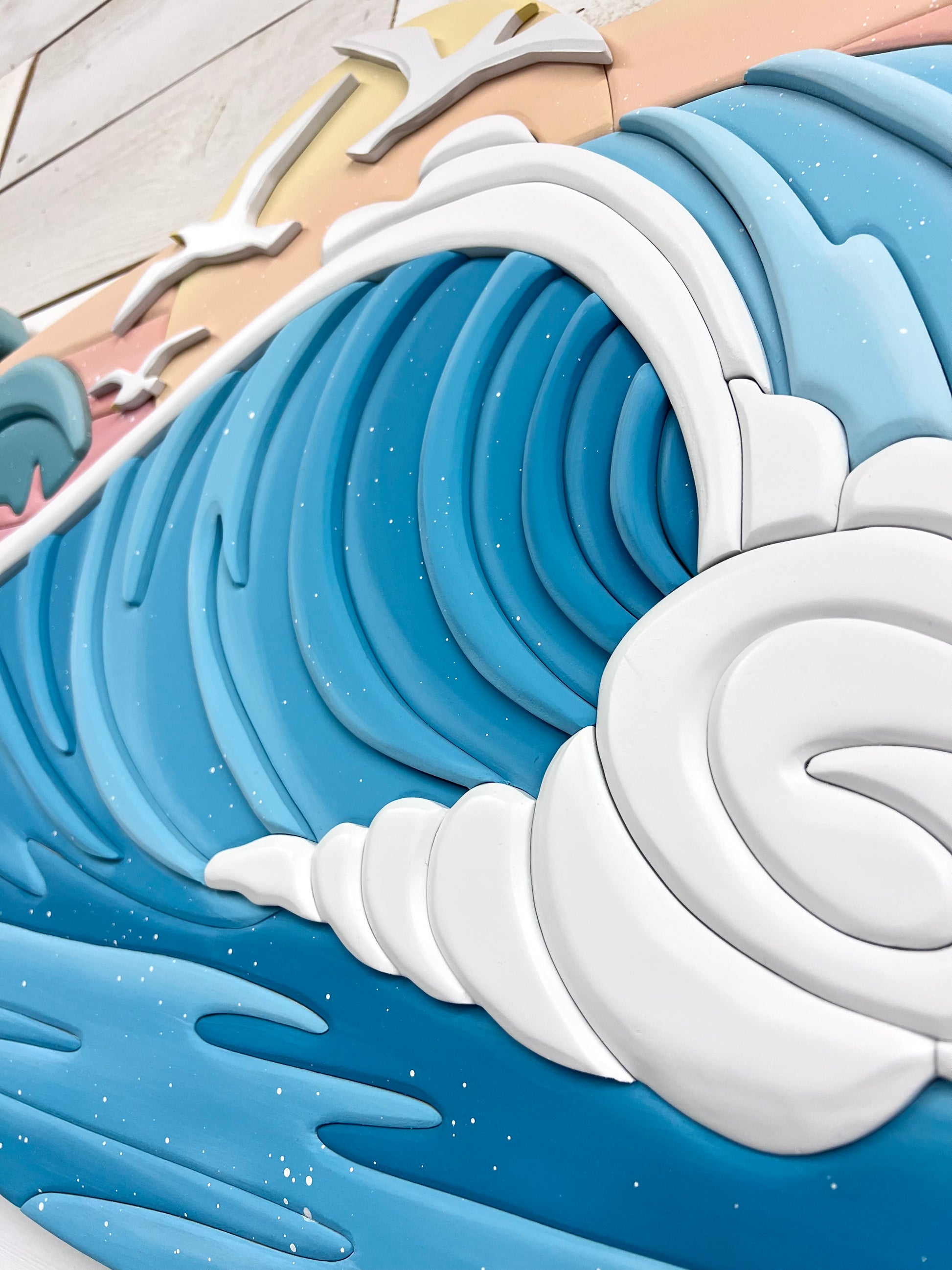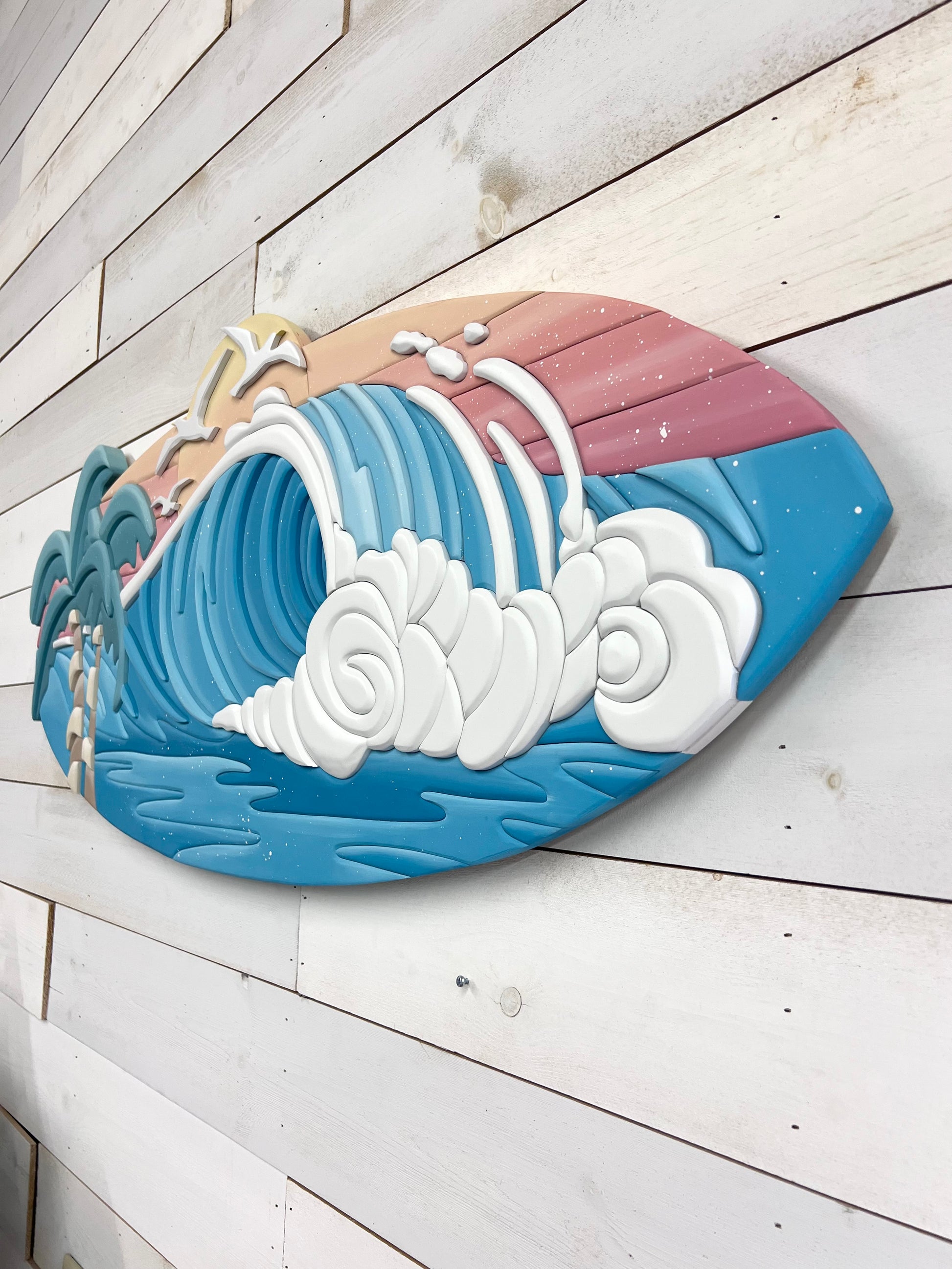 Take your home decor to the next level with the BIG Ocean Wave Surfboard! Handcrafted and painted with a serene sky, ocean wave, sunset, and palms, this surfboard adds beachy vibes and charm to any space. Don't miss out on this one-of-a-kind beauty that brings a little sunshine to your home all year round!