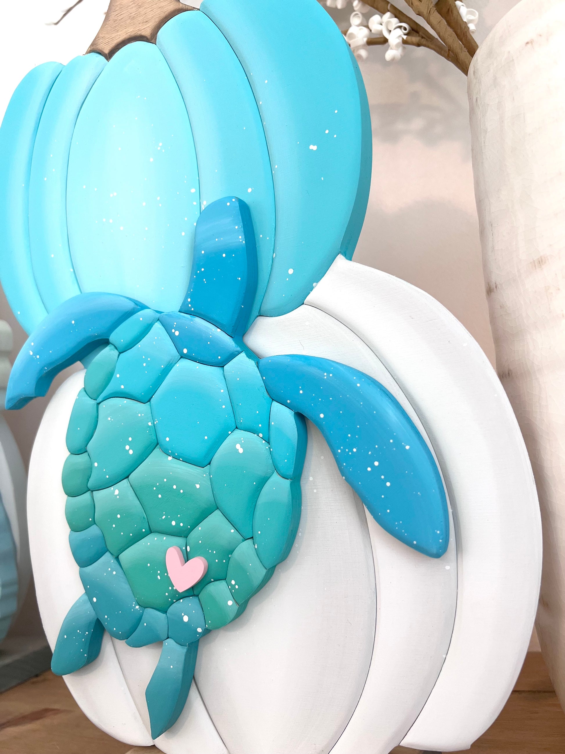 Celebrate fall with a splash of coastal charm! This handcrafted double pumpkin stack features a delightful sea turtle in beautiful coastal colors. Made from wood and hand-painted with care, it’s the perfect table sitter to brighten your space. Your guests will be enchanted by this playful, seaside-inspired autumn touch.