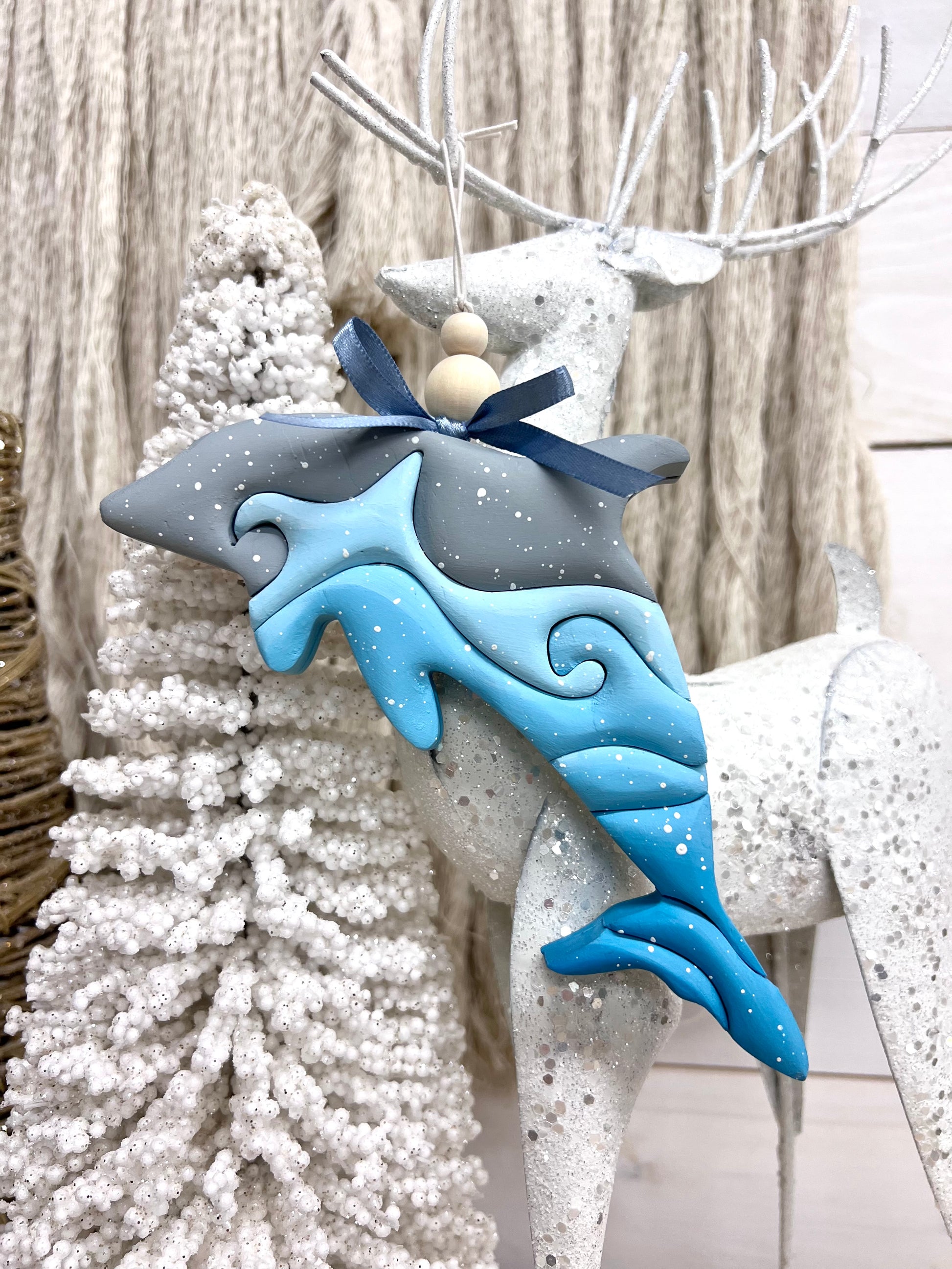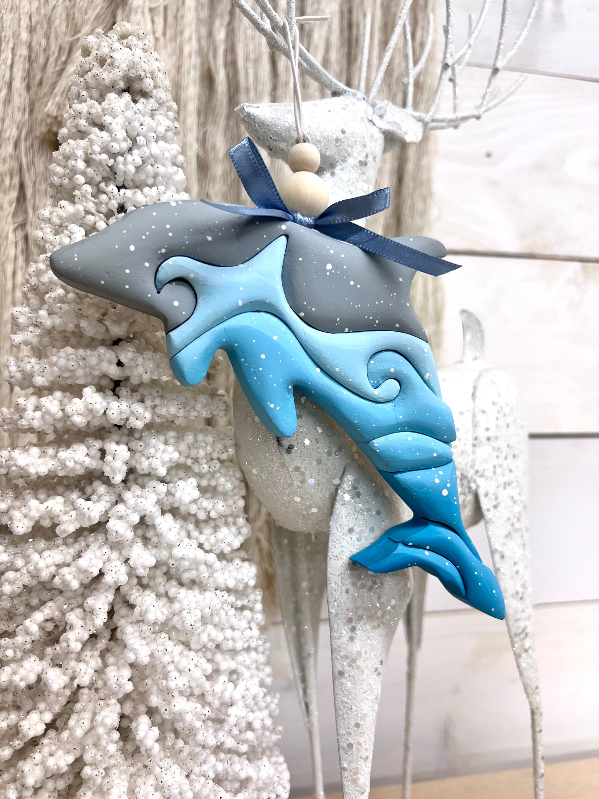 Bring a playful touch to your holiday decor with our unique Handcrafted Dolphin Ornament. Expertly hand painted with intricate detail, this festive ornament is a must-have for any Christmas tree. Don't miss out on this one-of-a-kind piece that will add charm and whimsy to your decorations!