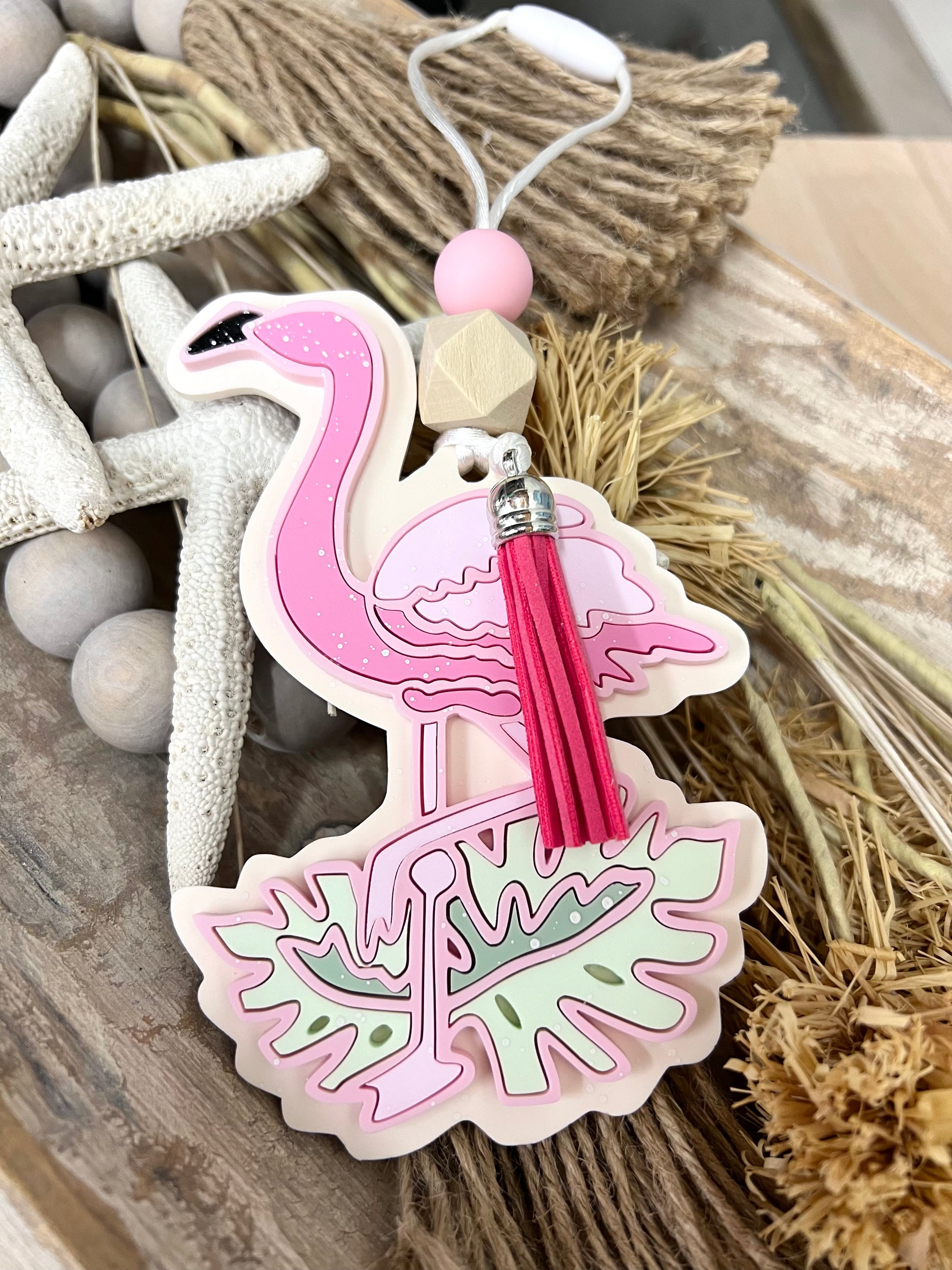 Elevate your daily commute with our DOUBLE-SIDED Flamingo Car Charm! Made from durable acrylic, these UV-resistant charms feature intricate detailing and a charming tassel. Perfect for adding a touch of coastal charm to your car. Get yours now!