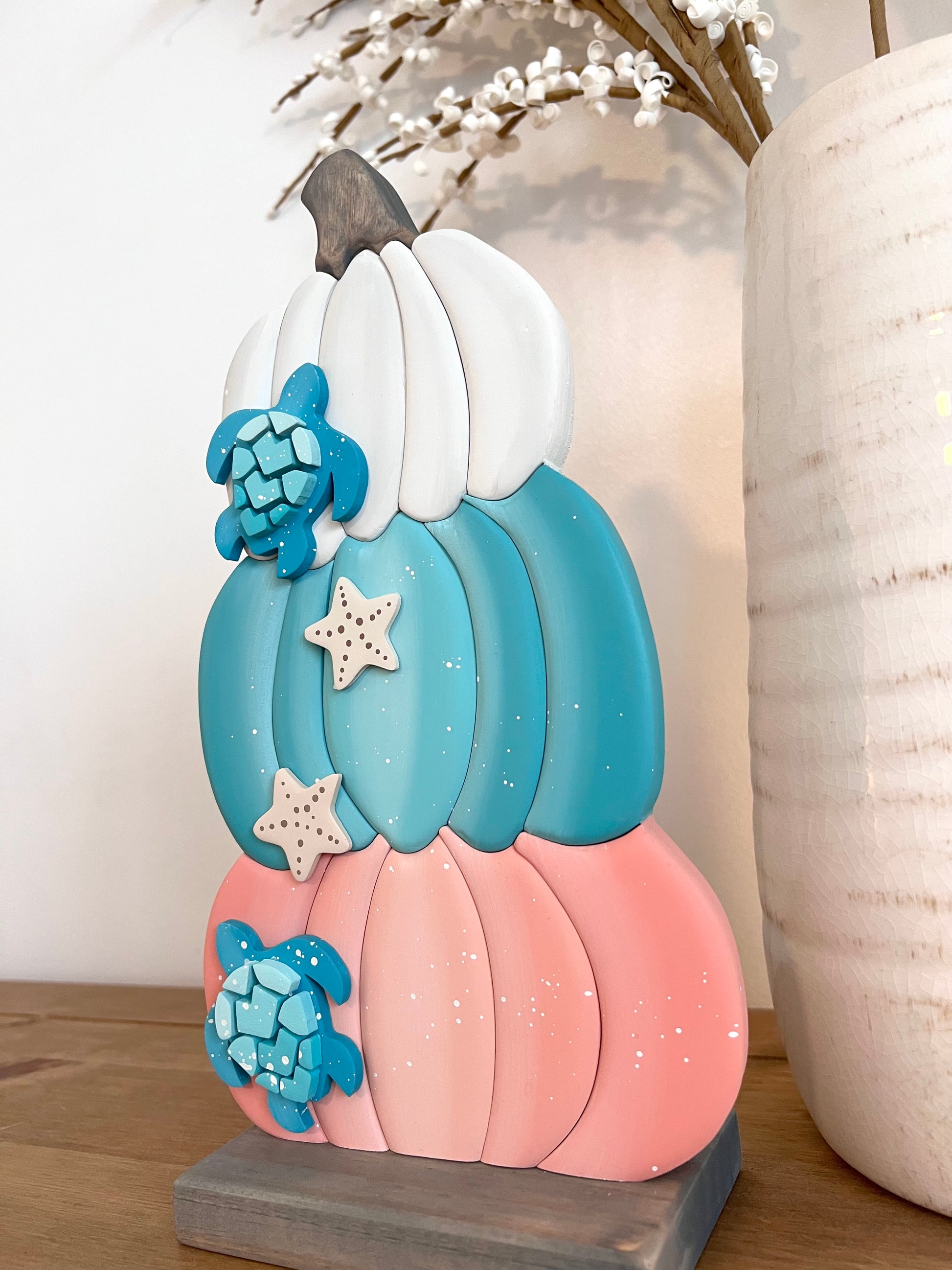 Embrace the fall season with this handcrafted triple pumpkin stack, featuring charming little sea turtles and starfish in beautiful coastal colors. Expertly made from wood and hand-painted, this table sitter adds a tasteful, beach-inspired touch to your autumn décor. Its unique design invites admiration, making it a delightful focal point that will impress your guests.