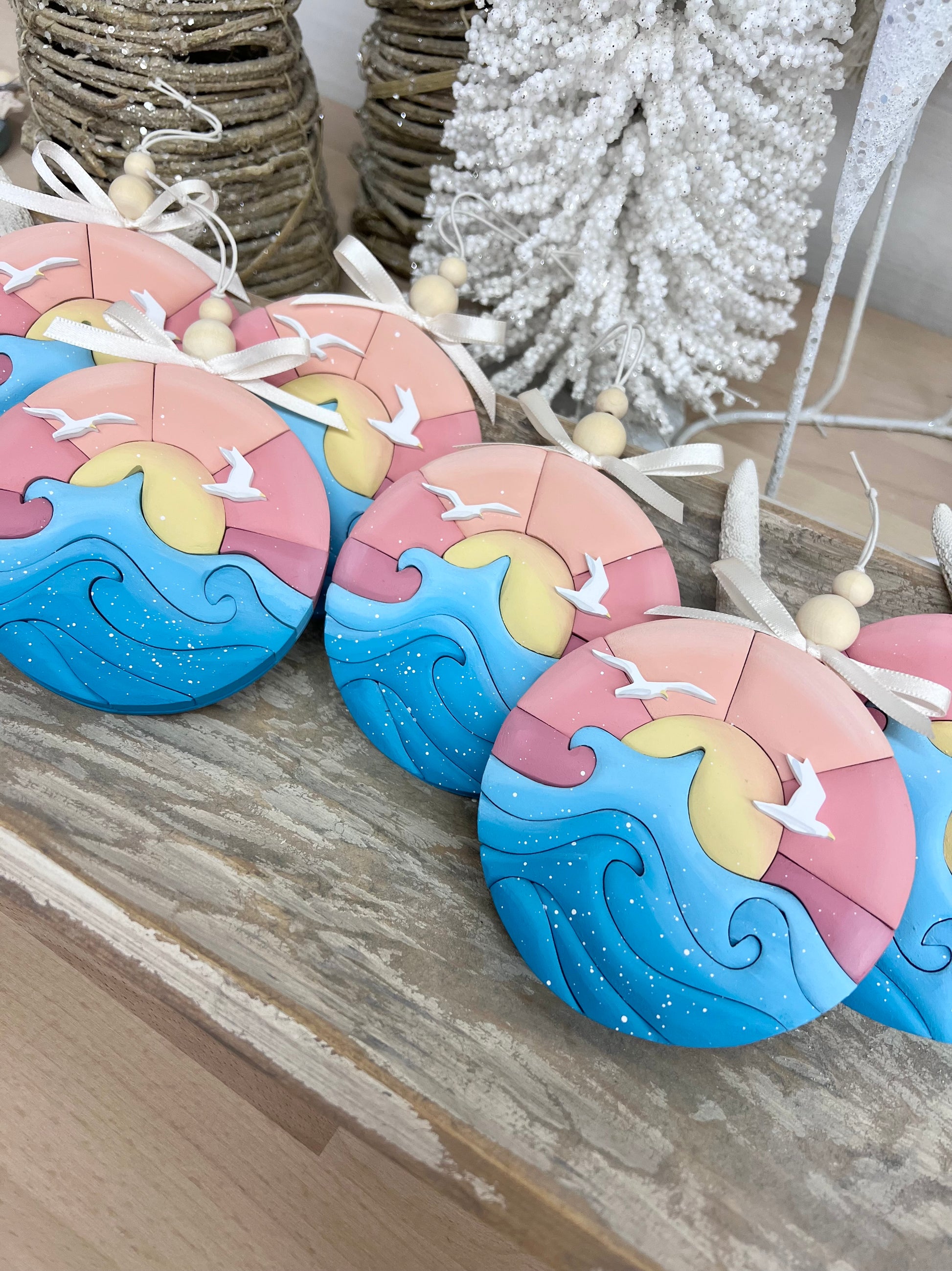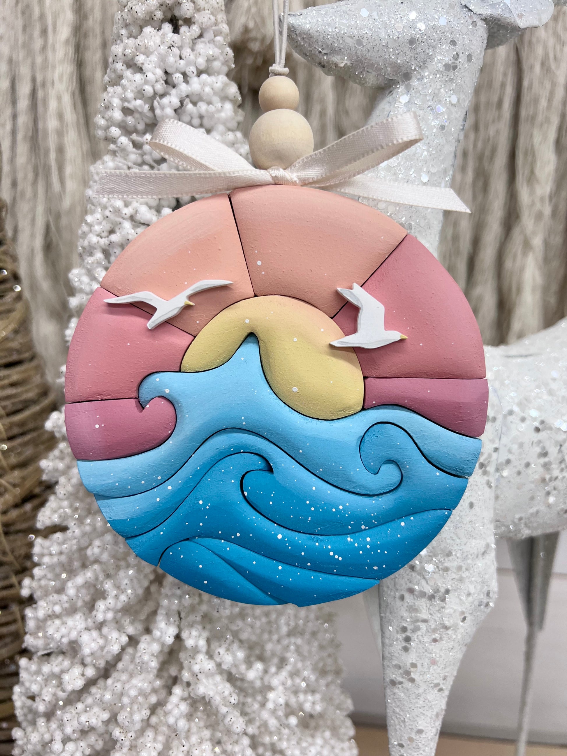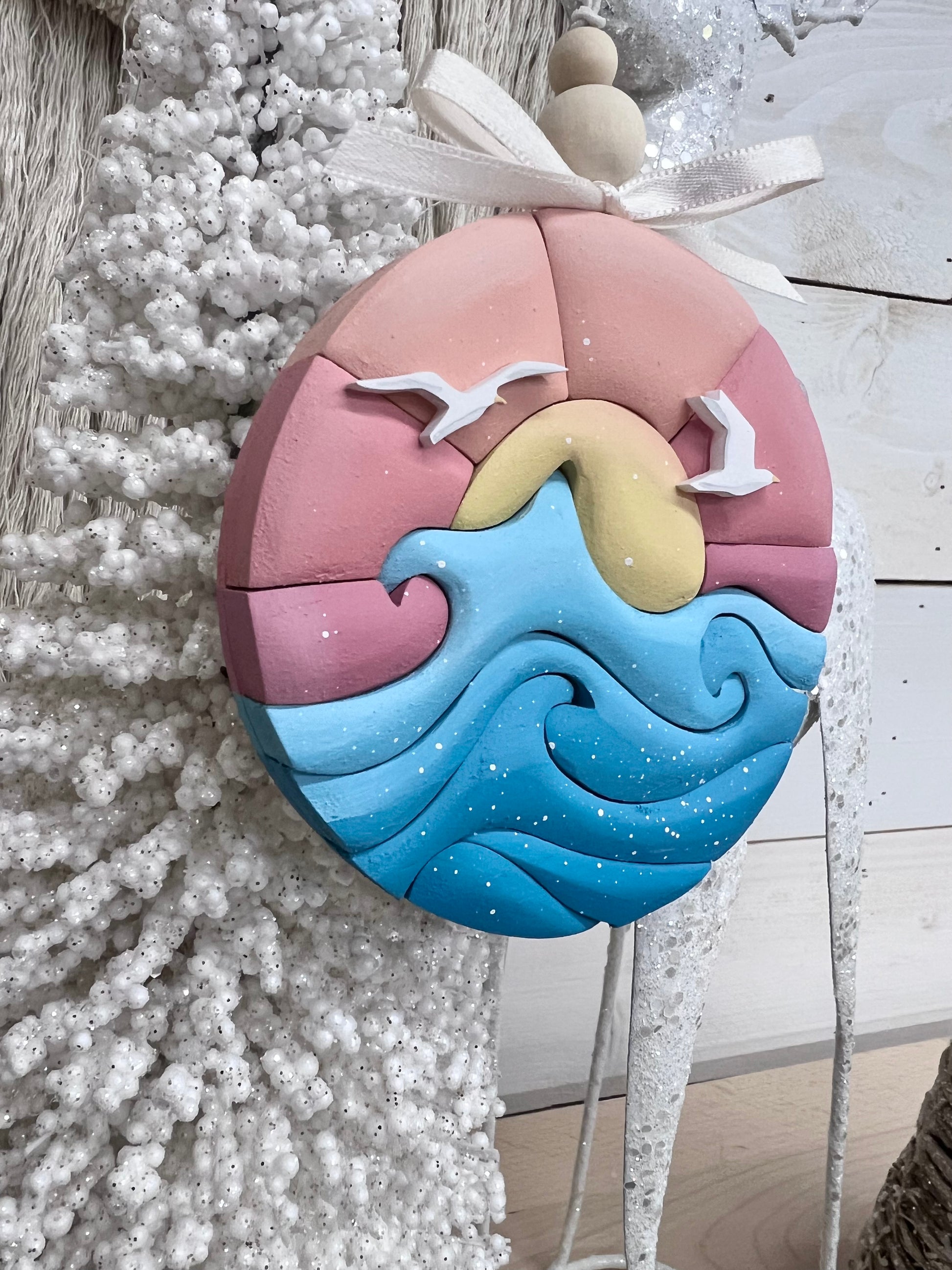 Add a touch of the beach to your decor with our handcrafted Sun, Wave & Seagulls Ornament. This one-of-a-kind piece features festive hand-painted details and a unique design. Enhance your decor with our charming ornament and make your festivities even more special. Don't wait - get yours today!